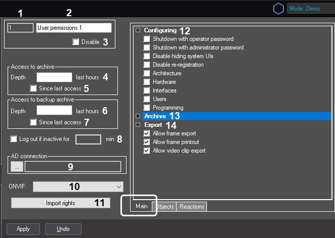 14 | The Allow frame export | Set the checkbox | Allows exporting the archive frames | Boolean type | Set | Set—operator added to these rights can export frames Clear—operator cannot export frames |