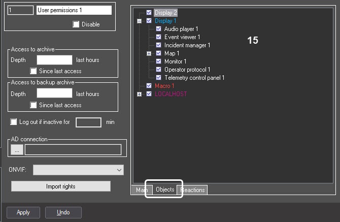 15 | The list of system objects* | Set the checkbox | Displays the objects created in the system and allows setting rights for administration and monitoring | NA | NA | See Limiting access to the system objects administration, control and viewing functions |