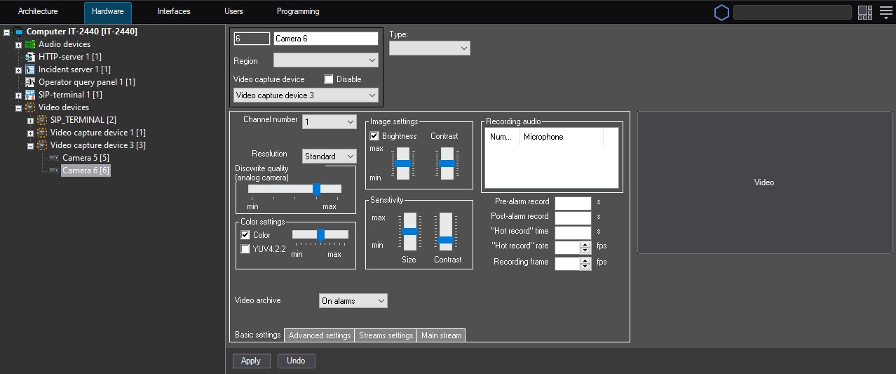 From the Channel number list, select the physical video card input to which the camera is connected (see Features of video subsystem configuration).