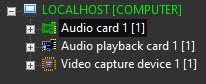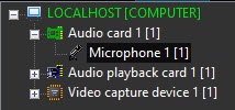 Microphones embedded into or connected to IP devices are registered in Axxon PSIM™ by creating the Microphone objects under the Audio card object. Under one Audio card object there are the Microphone objects in amount corresponding to the amount of audio input channels and restrictions applied by a license key. Corresponding segment of hardware branch when IP device and one microphone are registered is shown in the figure.