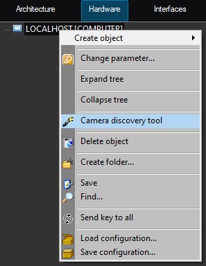 The Ip Wizard window can also be displayed by selecting the Camera discovery tool item in the context menu of the Computer object.