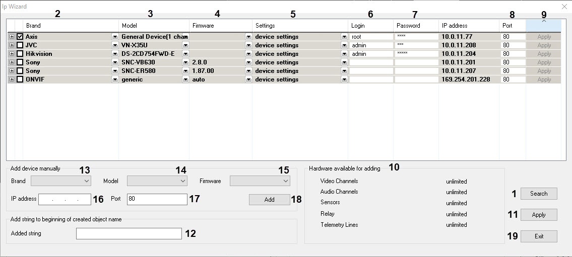 Video capture cards can also be displayed in the list. However, it is strongly NOT recommended to add them to configuration from the IP Wizard tool. Configure video capture cards manually as described in Configuring video capture cards in Axxon PSIM™ software.
