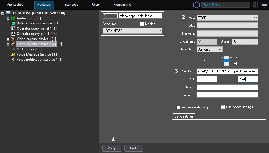 In the IP address field (3), enter the address of the RTSP stream. The length of the address must not exceed 100 characters.