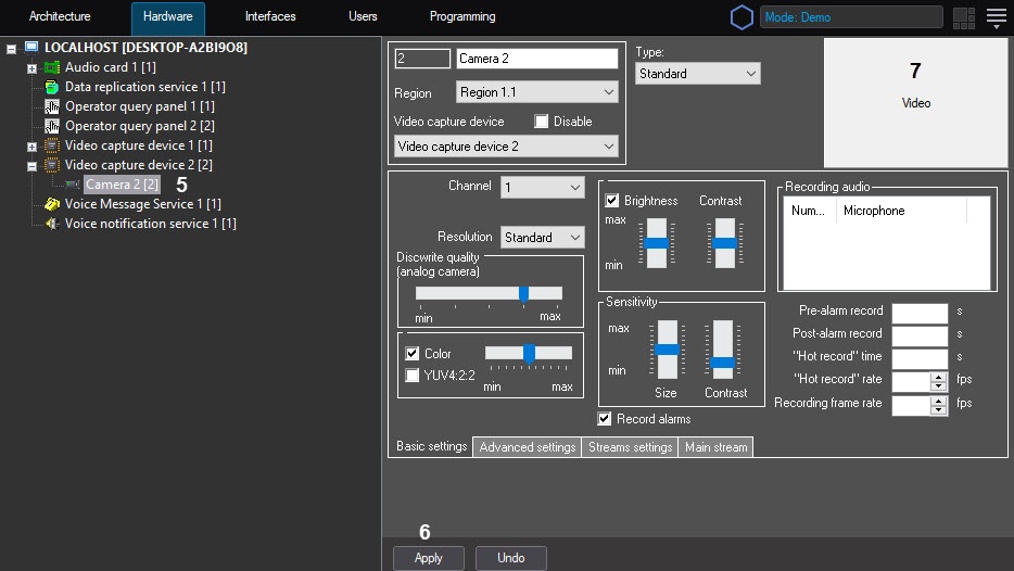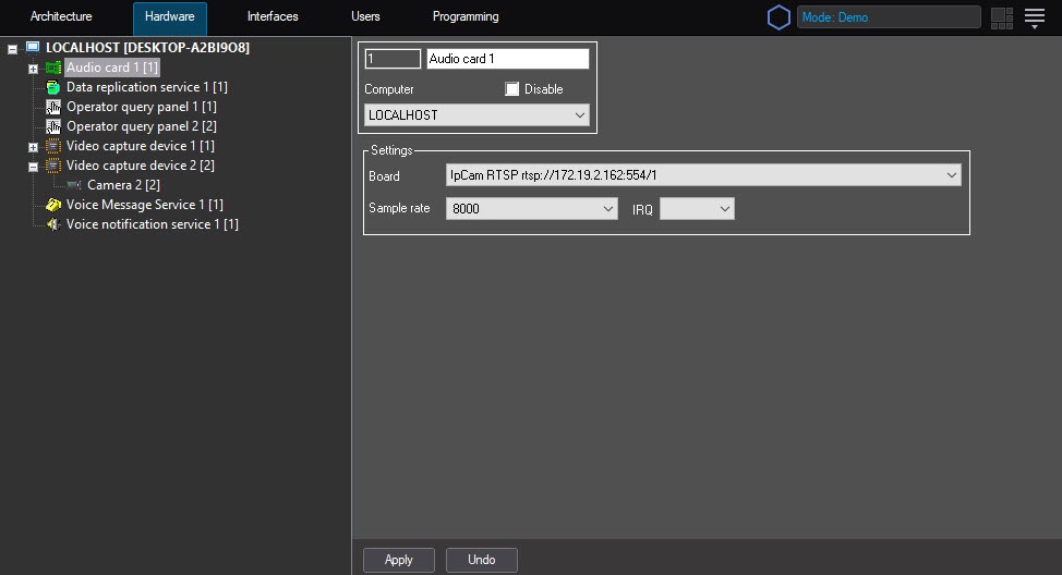 To receive an audio stream from a camera, you must create and configure the Audio card and Microphone objects for the audio stream from a camera that is received via the RTSP protocol. For this, select the RTSP type of the audio card (see Registration of audio cards and microphones in Axxon PSIM™ software).