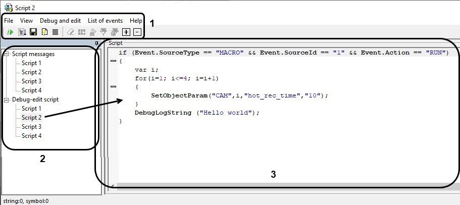 The user interface of the Editor-Debugger utility contains the main menu and the toolbar (1), the objects list (2) and the viewing/editing panel (3).