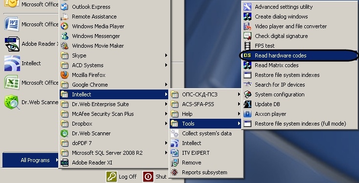 1. Start the utility from the Windows taskbar. Click Start, then All Programs, then Axxon PSIM, then Tools, then Read hardware codes. The CodeReader.exe utility is available for the following types of Axxon PSIM™ installation: Server and Remote Admin Workstation.