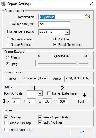2. Call for Export Settings dialog window in the opened window of Converter.exe utility and set its groups Choose folder, Frame Export, Compression and Screen (see. Interface description of The Export Settings dialog box).
