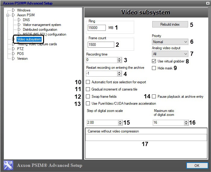 The Video subsystem section is used for advanced configuration of the video subsystem in order to enhance the performance of Axxon PSIM.