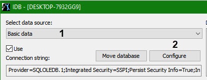 When you switch between databases using the Select data source drop-down list (see Interface elements of the idb.exe window), note that the specified parameters for connecting to the currently selected database are partially reset. This is due to the Microsoft security policy. In order for the settings in the Connection string field to be saved, do the following before you switch to the administration of another database: