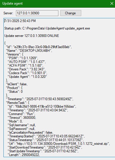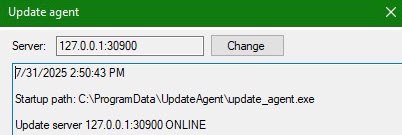 The bottom part of the Update agent window displays information about the client (update agent):