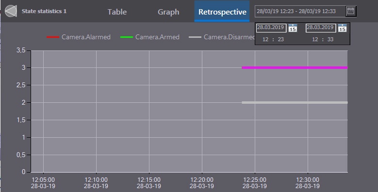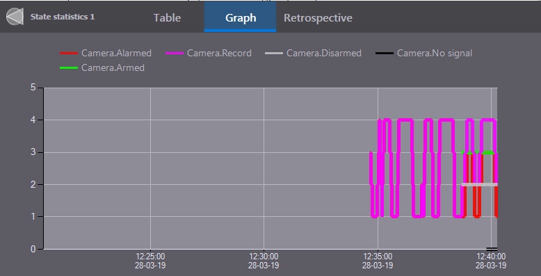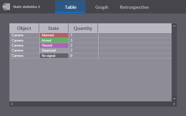 The Graph tab displays the state statistics graph over time for the last 15 minutes. The displayed objects and the points number on the graph are configured during the system setup (see Selecting objects to include in State statistics and configuring pixel number).