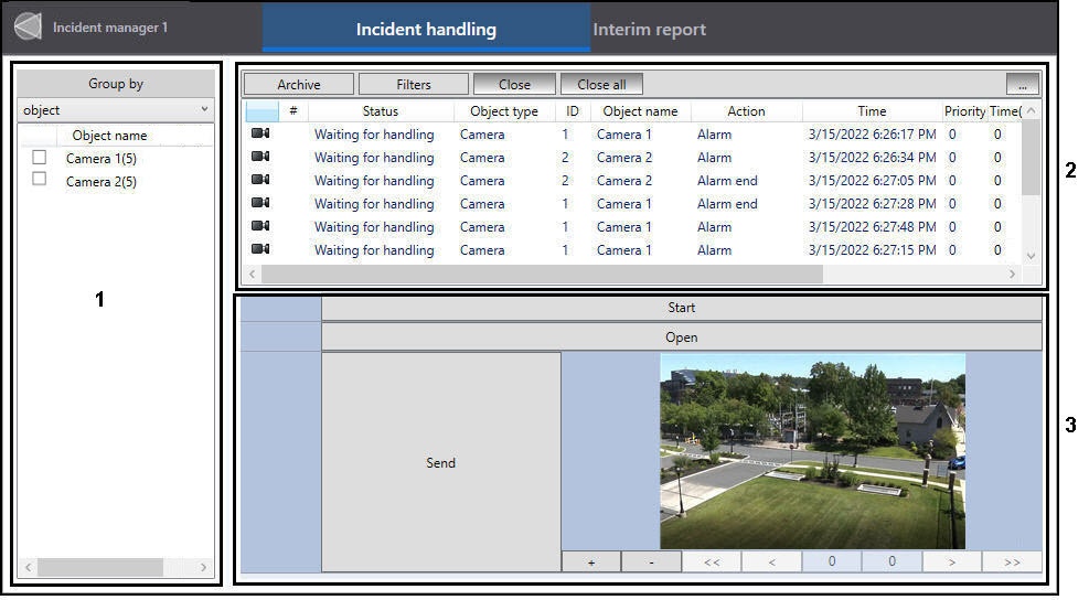 In addition to control and handling of events in the incident manager, you can generate a report on the operator's actions—see Interim report, and view the video or object corresponding to the event on the map—see Display of video and object on the map.