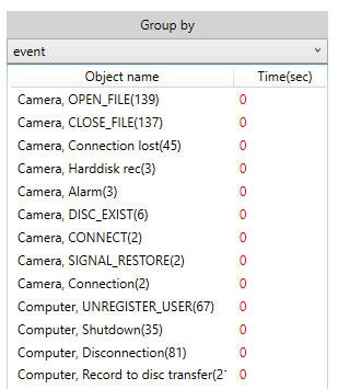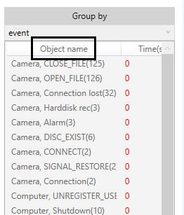 The Object name column contains the grouping parameter and the number of events in the group (in brackets). The Time(sec) column shows the time in seconds until the countdown timer expires. In this case, the last generated event with timer is taken into account for the group.