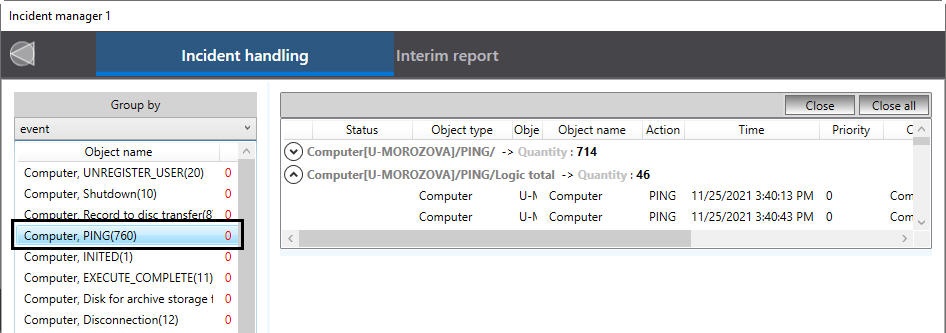 Grouping events sets the event groups according to the specified parameters in the table with the list of events. Possible grouping options are set in the Configuring events grouping in Incident manager: