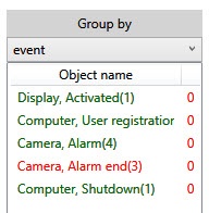 Example: Operator 1 uses grouping by objects (cameras), Operator 2 uses grouping by events. Events are generated by cameras. Operator 2 takes into processing an alarm event of any camera. The group becomes "green" for Operator 2. For Operator 1 all groups become "red", because Operator 2 took into processing an alarm event of all cameras. Because of this, for Operator 2 all groups also become "red".
