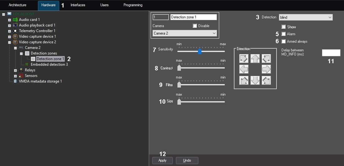 To disable disarming of the abandoned objects detection tool by any user (irrespectively of his rights), set the Armed always checkbox (6).
