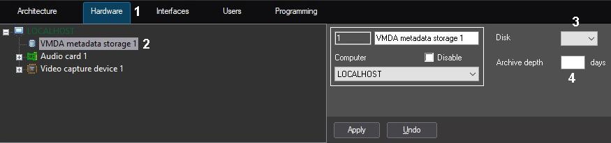 2. Create the VMDA metadata storage object on the base of the Computer object in the objects tree. The settings panel for the created object appears in the right part of the Hardware tab (2).