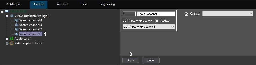 1. Create a Search channel object under the VMDA metadata storage object (1). The number of available search channels is determined by the number of cameras in the license key.
