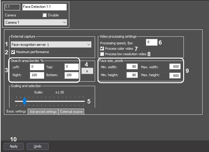 Set the minimum and maximum width and height of the face on the video image in pixels in the corresponding fields of the Face size, pixels group (9).