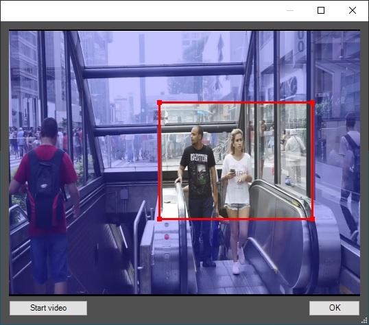 Set the face search area border on the video image by specifying the required values in percent in the corresponding fields (3), or by clicking the button (4) and using the interactive interface. After you click the button, the window with the corresponding video camera image will open. To set the face search area border, click the Stop video button at the required time, select the required area using the left mouse button, and then click OK. The specified face search area border values will be automatically entered in the Left, Right, Upper and Lower fields of the Search area border % group.