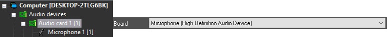 Each multi-channel audio input device is registered in Axxon PSIM by creating and configuring the Audio card object. The Audio card objects are created on the Hardware tab on the basis of the Computer object. When you create the Audio card objects for each multi-channel audio input device, you must assign values of the Board parameter that correspond to the name of the multi-channel audio input device.