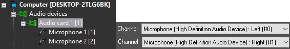 Microphones connected to the channels of the multi-channel audio input device are registered in Axxon PSIM by creating and configuring the Microphone objects on the basis of the Audio card object. You can place the Microphone objects on the basis of one Audio card object in the number that corresponds to the number of audio input channels of the configured device with limitations imposed by the license activation key. The corresponding hardware tree section during the registration of the standard audio card and two microphones is shown in the figure.