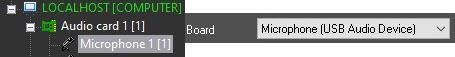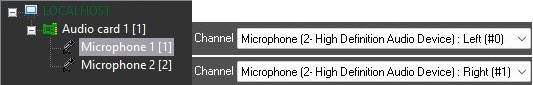 To register the microphones, connected to the multi-channel audio capture device input audio channels, create Microphone objects on the base of the Audio card object. The number of Microphone objects, allocated on the base of a single Audio card object, is defined by the number of audio input channels and restricted by the License key file. The relevant hardware tree segment during the registration of the standard sound card and 2 microphones is shown in the figure.