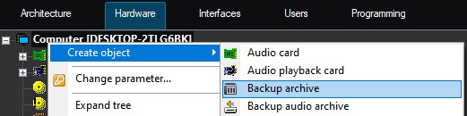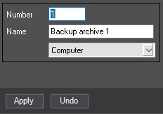 In the window that appears, set the number and name of the Backup archive object and then click the Apply button.