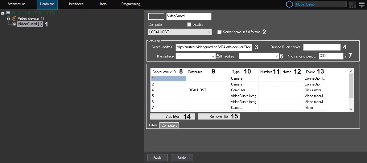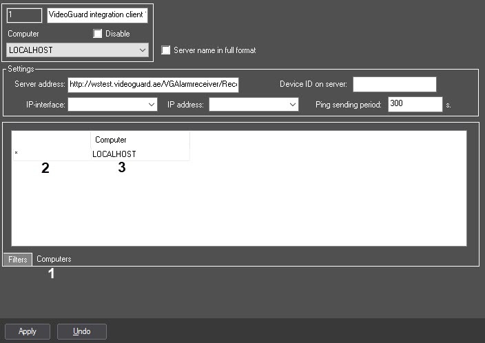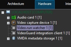 Create the VideoGuard integration client object on the basis of the Computer object on the Hardware tab of the System settings dialog box (1). If data from several Axxon PSIM servers in a distributed system should be sent to VideoGuard, then create and configure a separate VideoGuard integration client object on the basis of each server.
