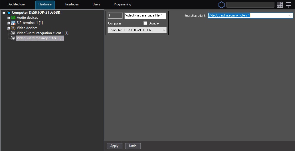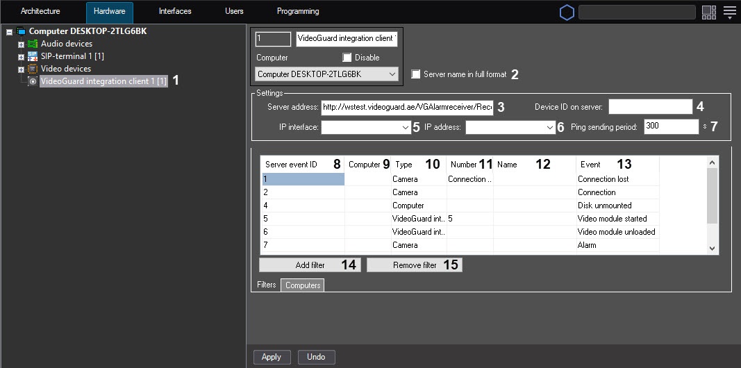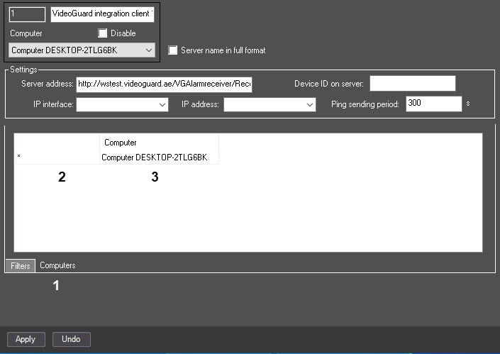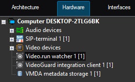 Create the VideoGuard integration client object on the basis of the Computer object on the Hardware tab of the System settings dialog window (1). If you want to send data from several Axxon PSIM servers in the distributed system, then you must create and configure the separate VideoGuard integration client object on the basis of each server.