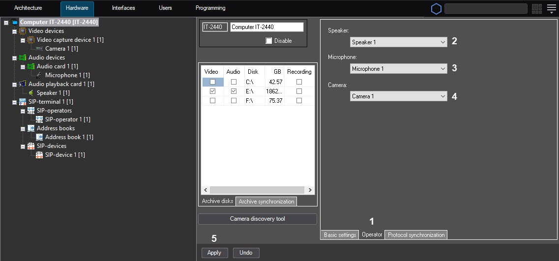 Selecting the speaker, microphone, and camera for the SIP-operator is complete.