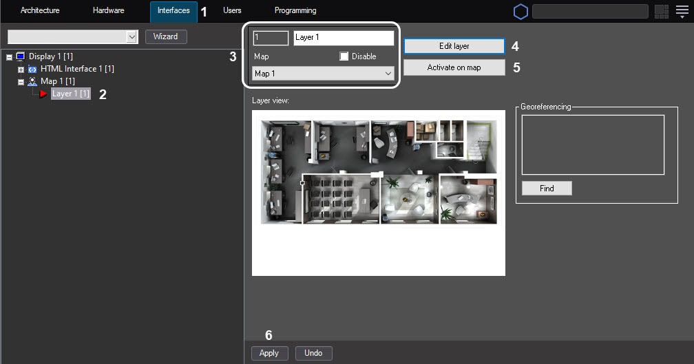 In Axxon PSIM, you can place several graphical plans of the protected facilities in one window of the interactive map. Each graphical plan is registered by the Layer object.