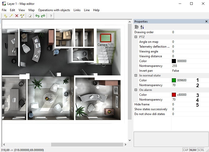 4. Set the degree of the line, polygon, or ellipsis transparency in the normal state (2). The lower the number, the higher the degree of transparency. 0 corresponds to full transparency, 255full nontransparency.