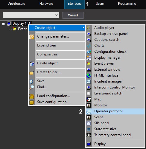 2. In the context menu of the Display object on which the created object is to be based, select the Operator protocol item in the Create object submenu (2).
