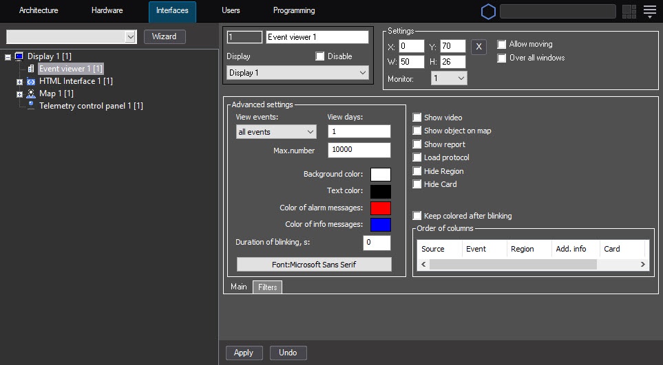 You can create and configure the Event viewer object on the Interfaces tab of the System settings window.