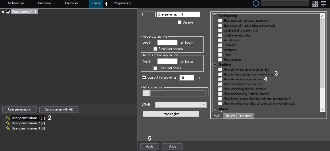 2. In the objects tree located under the User permissions button in the Users tab, select the same-name object corresponding to the Operator access permissions which should be changed (2).