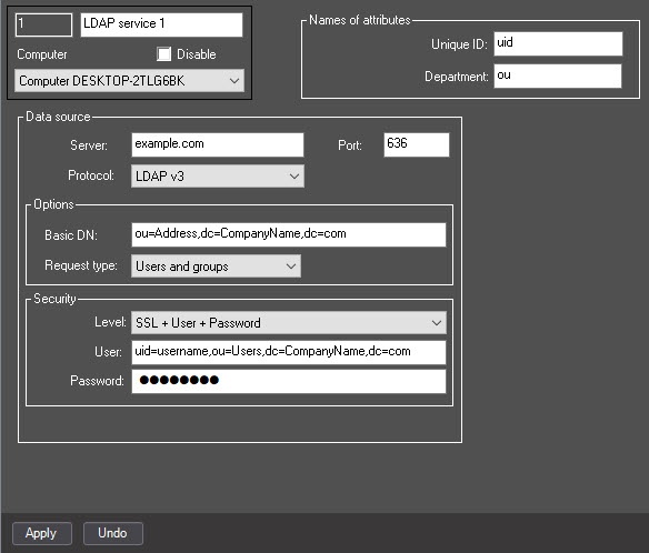 • you can specify a user through attributes, as in the examples, or directly by specifying the domain and user login with a backslash, for example, "Domain\Name", "LDAP\Admin". This way of specifying can result in longer synchronization time;
