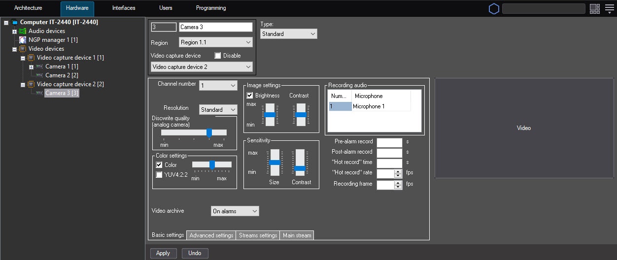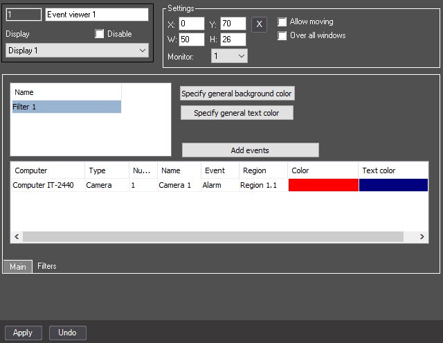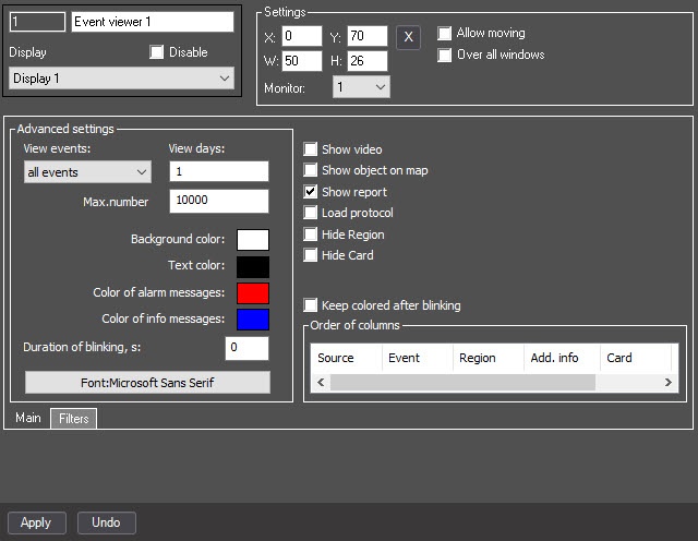 The figures below show the configuration of the Event viewer object, which allows you to display a report on the Alarm event from any camera related to the Region 1.1 object.