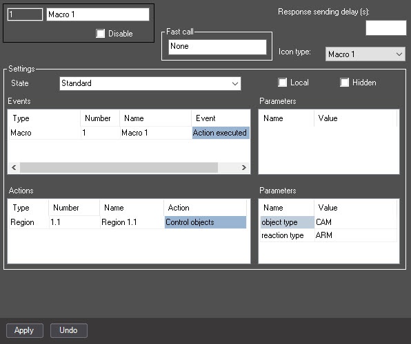Arming all cameras included in Region 1.1 when Macro 1 is run. The parameters of the macro are given in the table.