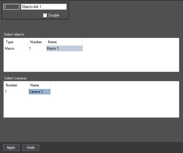 It is possible to link several cameras to each object and several and several objects to each camera. Also it is possible to link groups of objects and cameras.