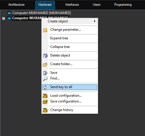 This function allows you to send the psim.sec activation key that regulates the system configuration to all computers that are part of the distributed digital video surveillance and audio control system. If you update the system functionality and receive a new activation key, you must update it on all computers that are part of the system, using the Send key to all function.