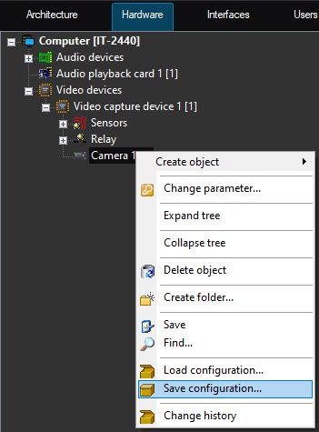 The Save configuration function allows saving the current configuration parameters of an object to a file with the .cfg extension so as to use these parameters for configuring other objects or to restore the configuration parameters of the current object after unexpected loss (for example, if an object is accidentally deleted).