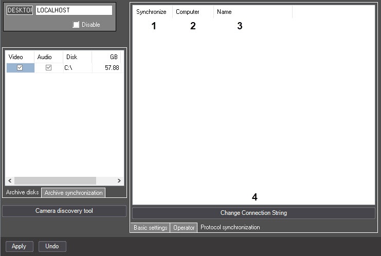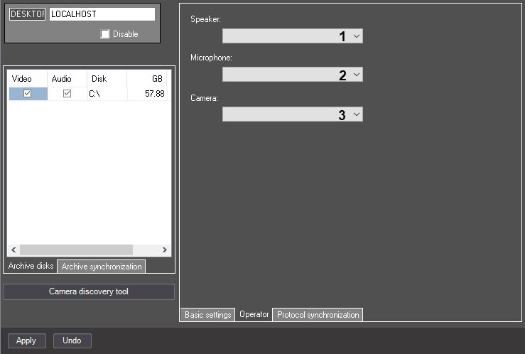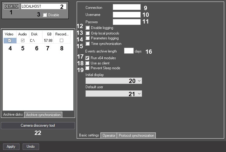 6 | The Disk | Automatically, enter the value in the field | Displays the names of the local disks available for storing the video and audio archives and also used to enter the names of the network disks used for archive storage | Names of the local disks (Latin alphabet), names of the network disks (UNC paths) | NA | Depends on the total number of the local and network disks |