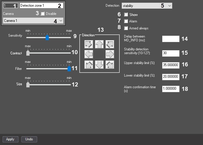 15 | The Stability detection sensitivity (10-127) field | Enter the value in the field | Sets the threshold of difference between the brightness of the pixel in the current frame and the background | Non-negative integer | 30 | From 10 to 127 |