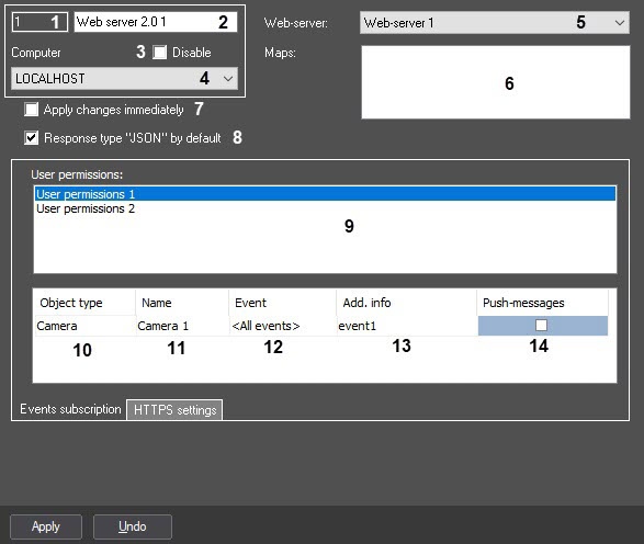 7 | The Apply changes immediately checkbox | Set the checkbox | Enables the function to apply the changes to the user permissions immediately | Boolean type | Clear | Set—the Web-server 2.0 object will immediately apply the changes to the user permissions Clear—when user permissions are changed (adding or removing permissions to objects in permissions/from permissions), access permissions aren't changed in the Web-server 2.0 object until the Apply button is clicked on the settings panel of the Web-server 2.0 object or Axxon PSIM is restarted |