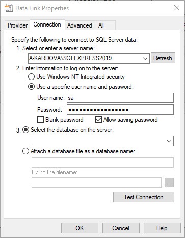 In the 1. Select or enter a server name line, select from the drop-down list or enter manually the name of the MS SQL server that stores the connected database.