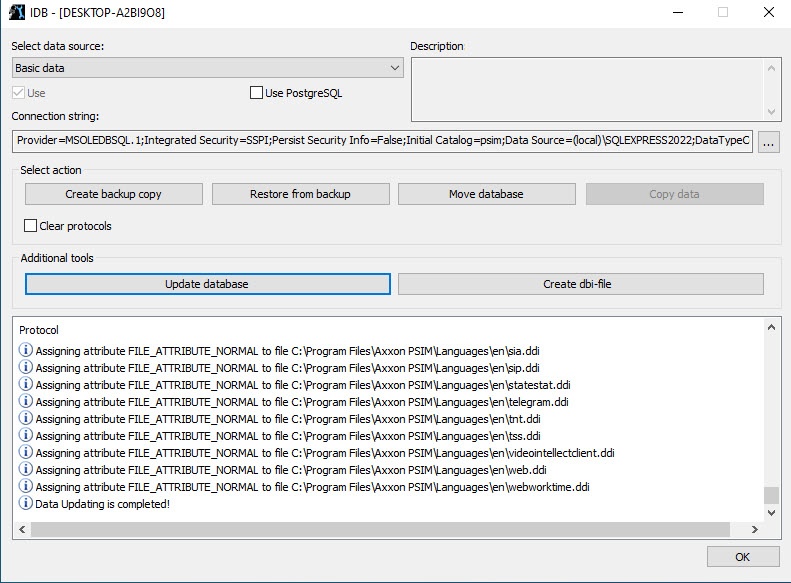 We highly recommend updating the database structure. For this, click the Update database button in the idb.exe utility dialog window. If you don't update at this step, it is automatically performed at the Axxon PSIM startup; however, it can be difficult to track errors in this case.