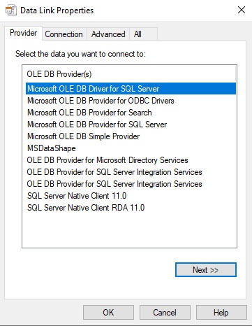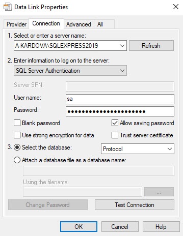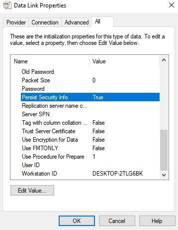 Each time you change the server connection parameters, you must set the True value in the Persist Security Info field.