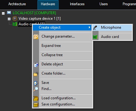1. Select Create object -> Microphone in the context menu of the Audio card object.