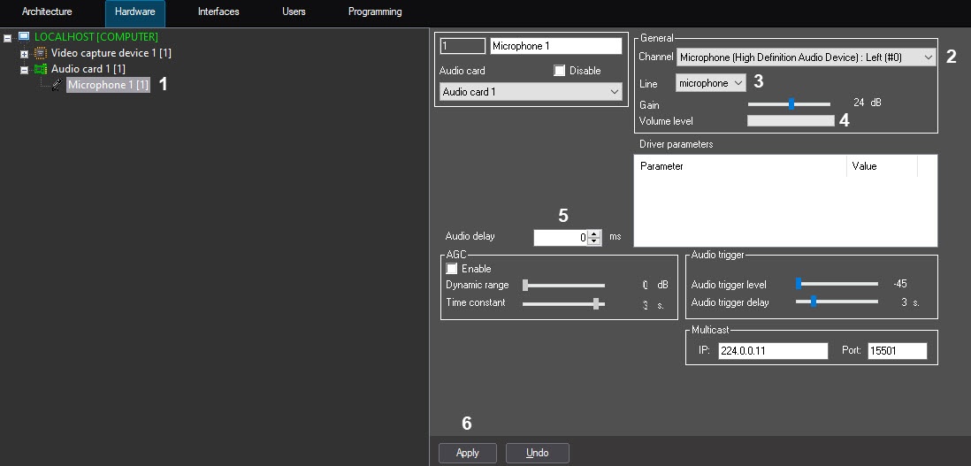 Detailed description of all settings of the Microphone object is given in Administrator's Guide.